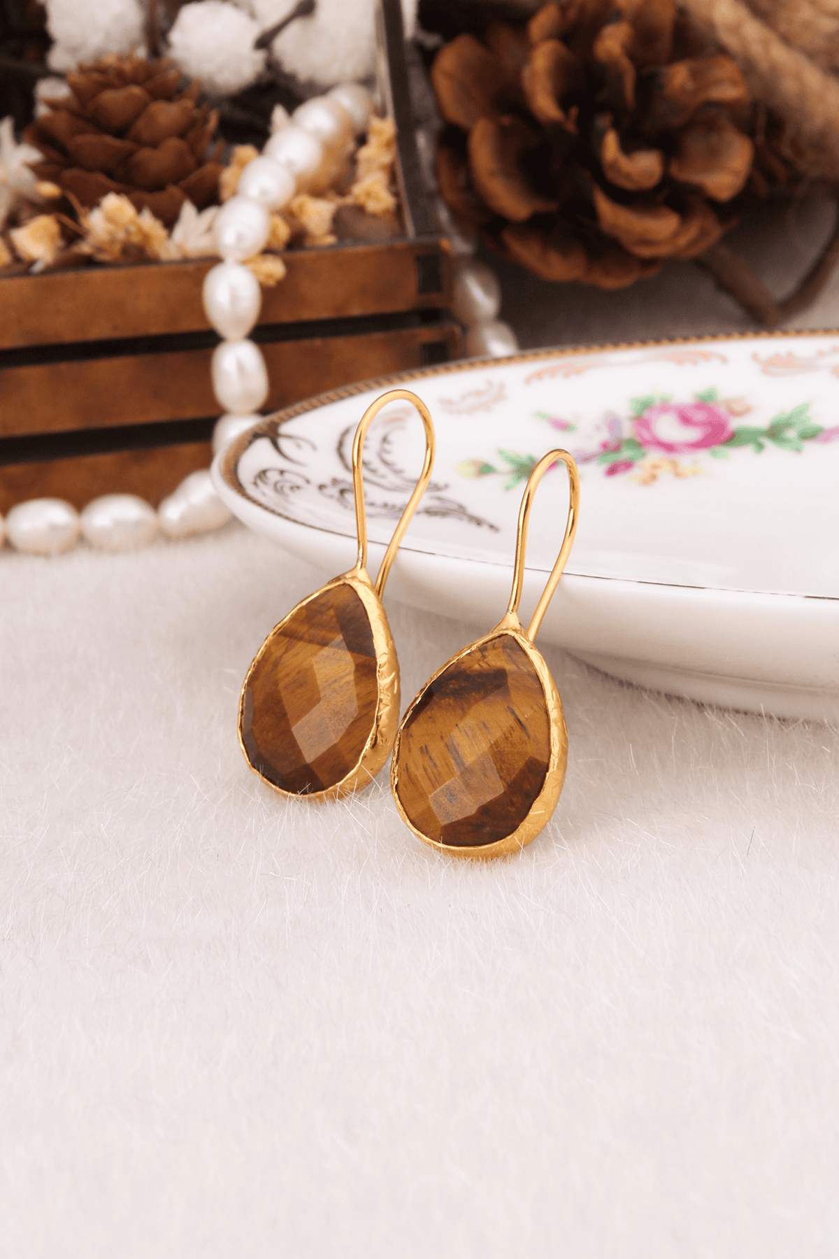 Boucles D’Oreilles – Bronze Et Laiton Dorés À L’Or Fin Et Œil-De-Tigre