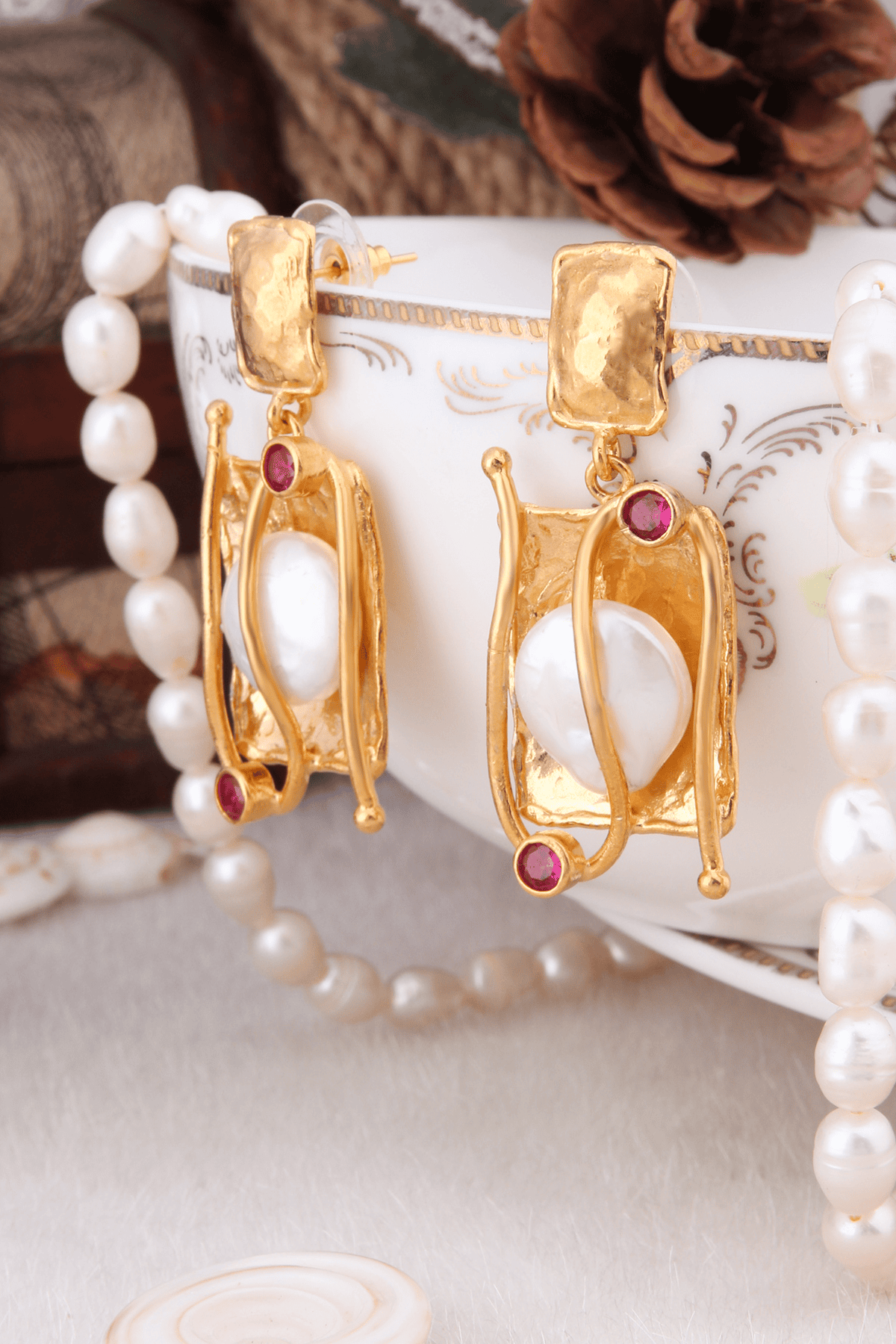 Boucles D’Oreilles Bronze, Zircons Et Perle De Culture